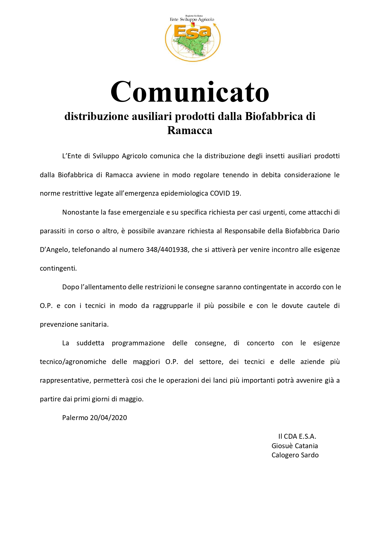 Comunicato distribuzione ausiliari prodotti dalla Biofabbrica di Ramacca