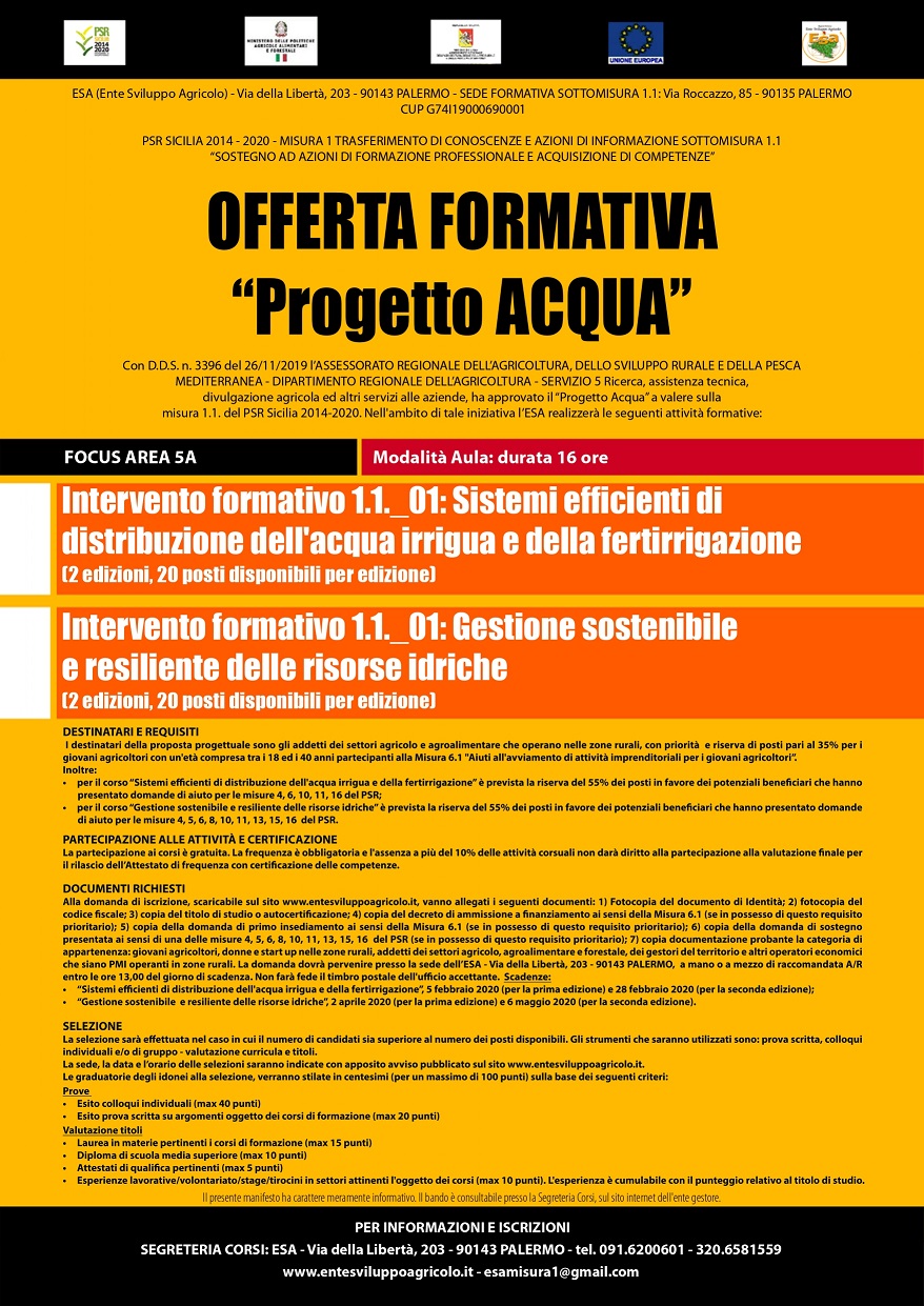 Con D.D.S. n. 3396 del 26/11/2019 l’ASSESSORATO REGIONALE DELL’AGRICOLTURA, DELLO SVILUPPO RURALE E DELLA PESCA MEDITERRANEA - DIPARTIMENTO REGIONALE DELL’AGRICOLTURA - SERVIZIO 5 Ricerca, assistenza tecnica, divulgazione agricola ed altri servizi alle aziende, ha approvato il “Progetto Acqua” a valere sulla misura 1.1. del PSR Sicilia 2014-2020.