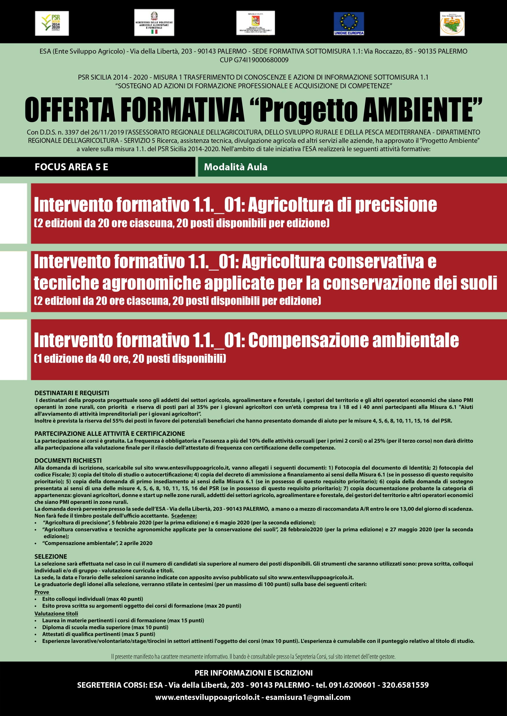 Con D.D.S. n. 3397 del 26/11/2019 l’ASSESSORATO REGIONALE DELL’AGRICOLTURA, DELLO SVILUPPO RURALE E DELLA PESCA MEDITERRANEA – DIPARTIMENTO REGIONALE DELL’AGRICOLTURA - SERVIZIO 5 Ricerca, assistenza tecnica, divulgazione agricola ed altri servizi alle aziende, ha approvato il “Progetto Ambiente”a valere sulla misura 1.1. del PSR Sicilia 2014-2020. Nell'ambito di tale iniziativa l’E.S.A. realizzerà le seguenti attività formative: